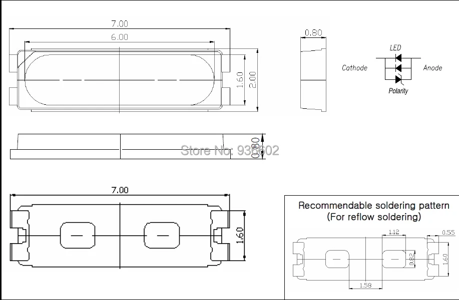 Тип рамы светодиода: 7.0 × 2.0 × 0.8 мм l×w×h = 6.0 мм